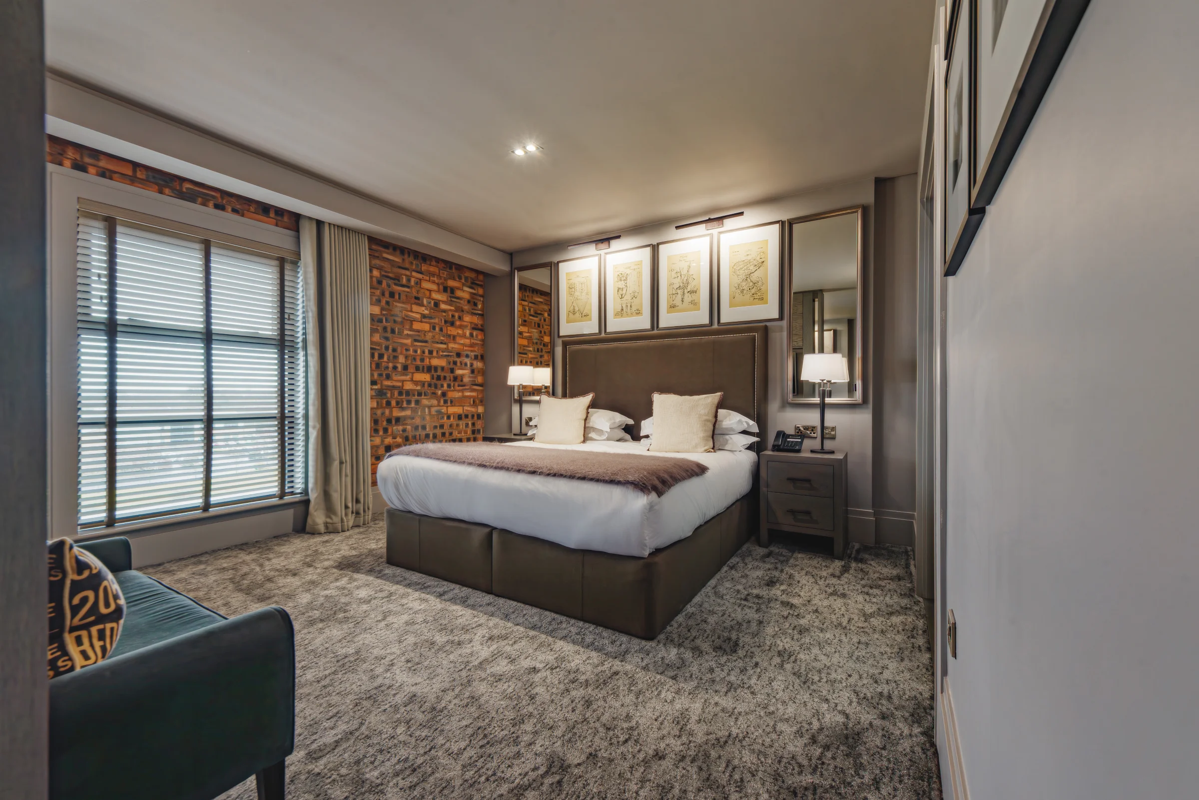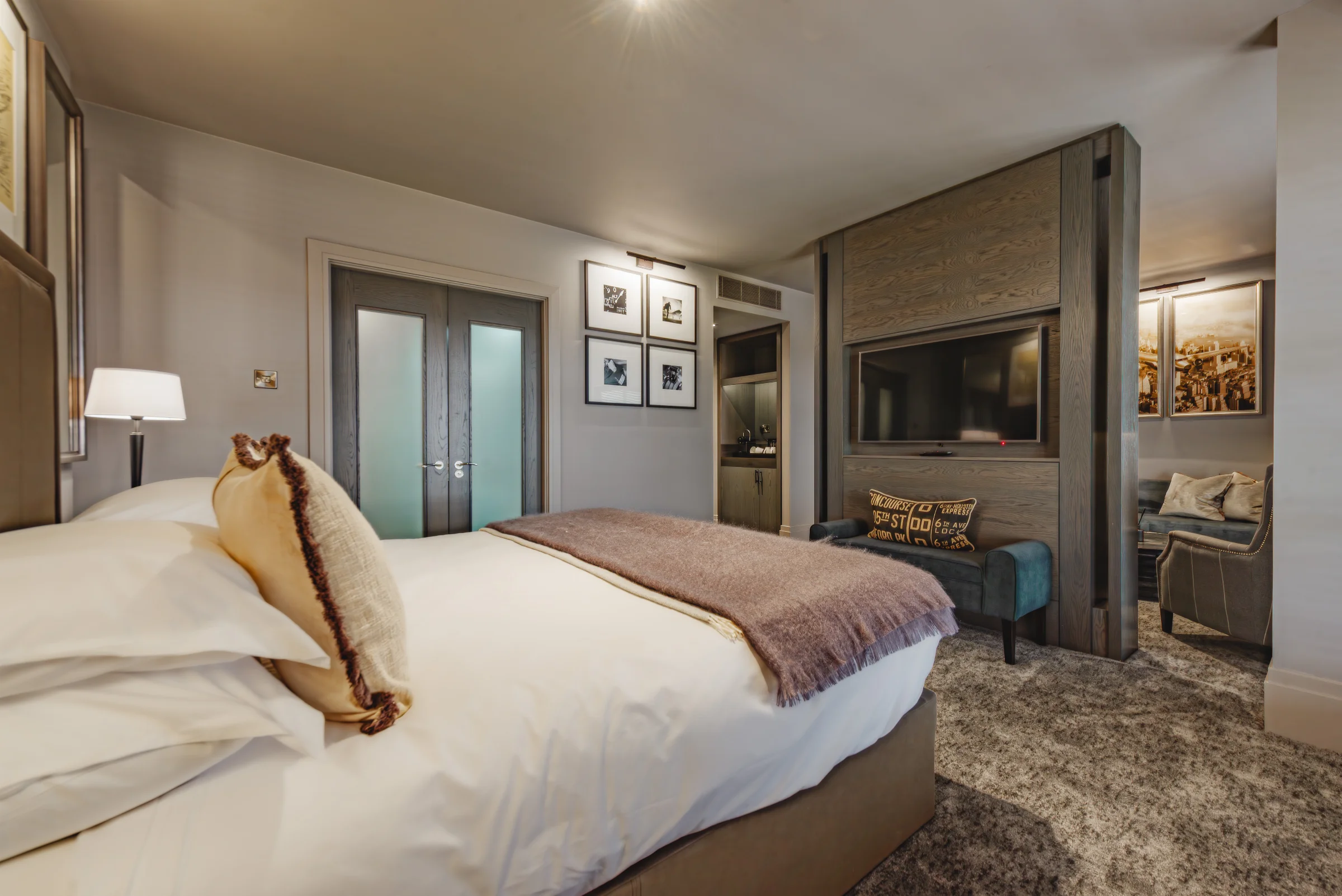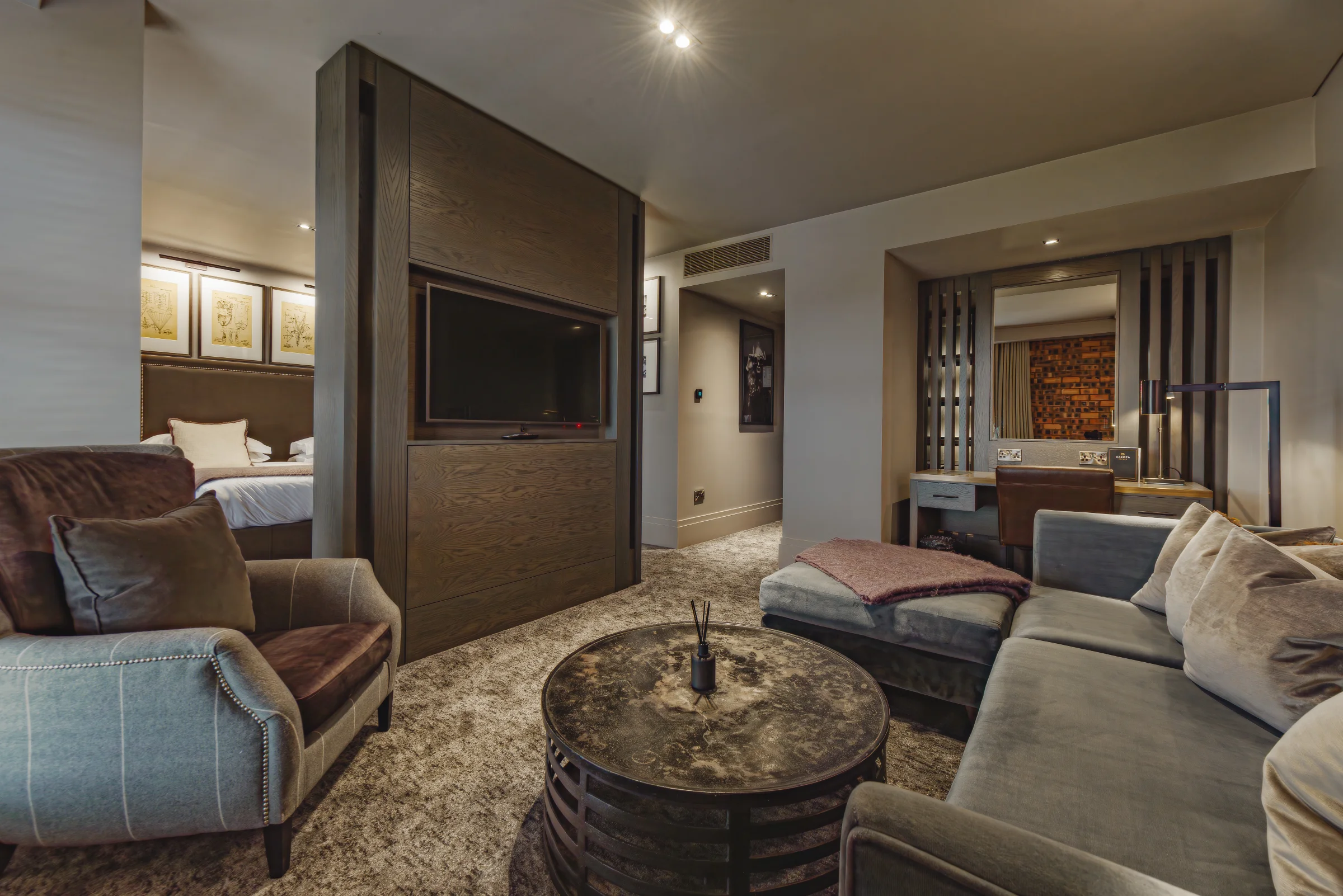 Indulge in luxury with a super-king size bed, separate bath, walk-in wardrobe, and stunning views of the Forth Rail Bridge. Includes private living room with two smart HDTVs, stocked mini-fridge, Nespresso machine, evening turndown and more.
