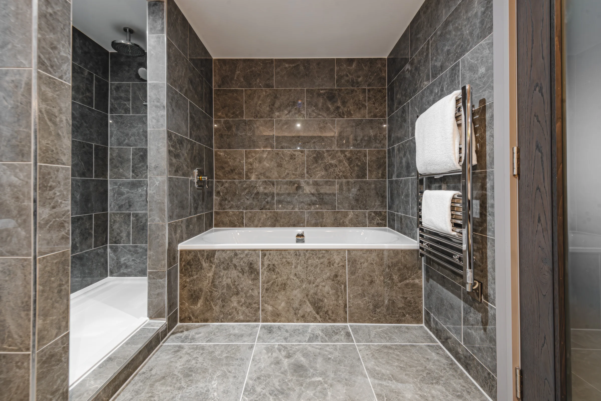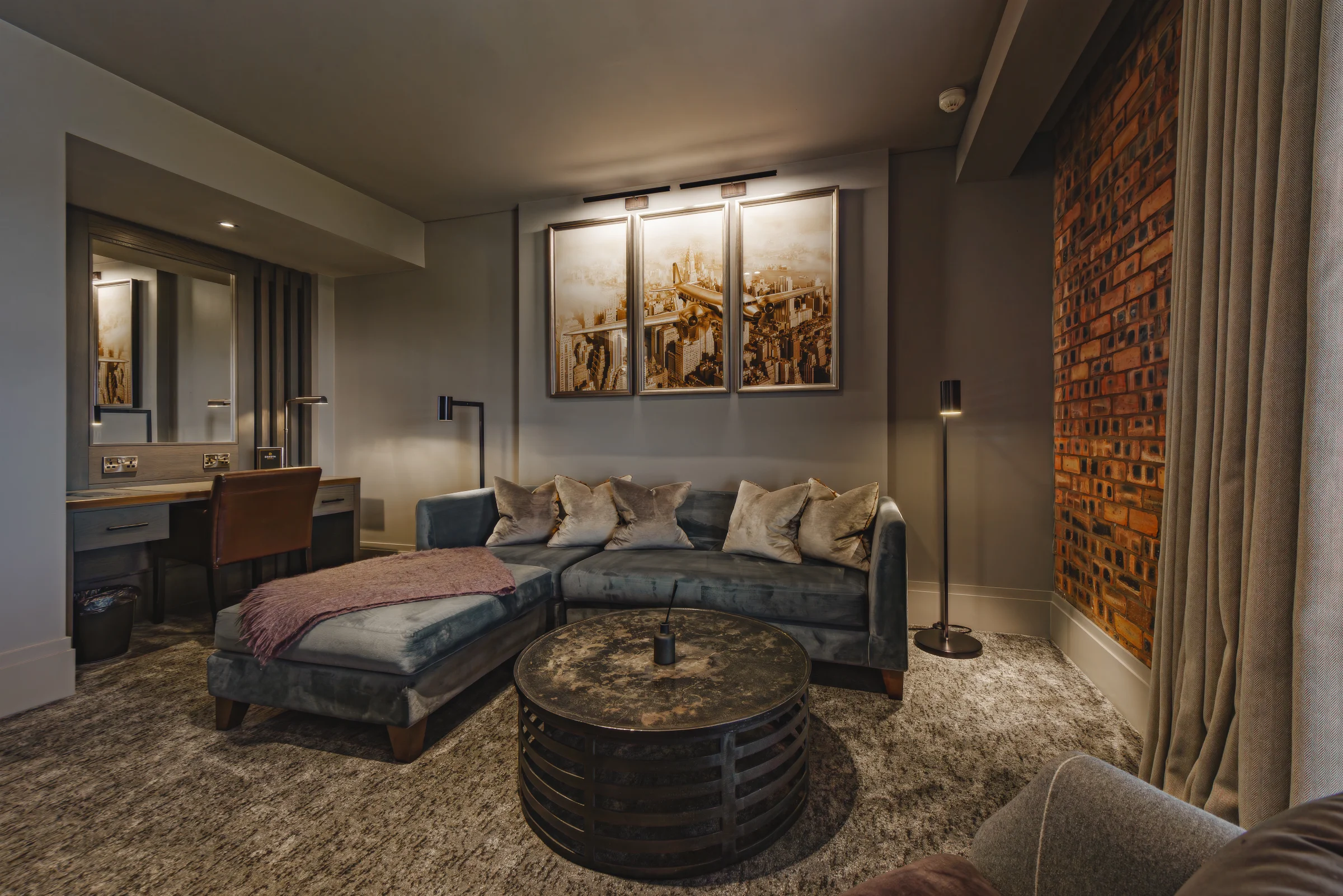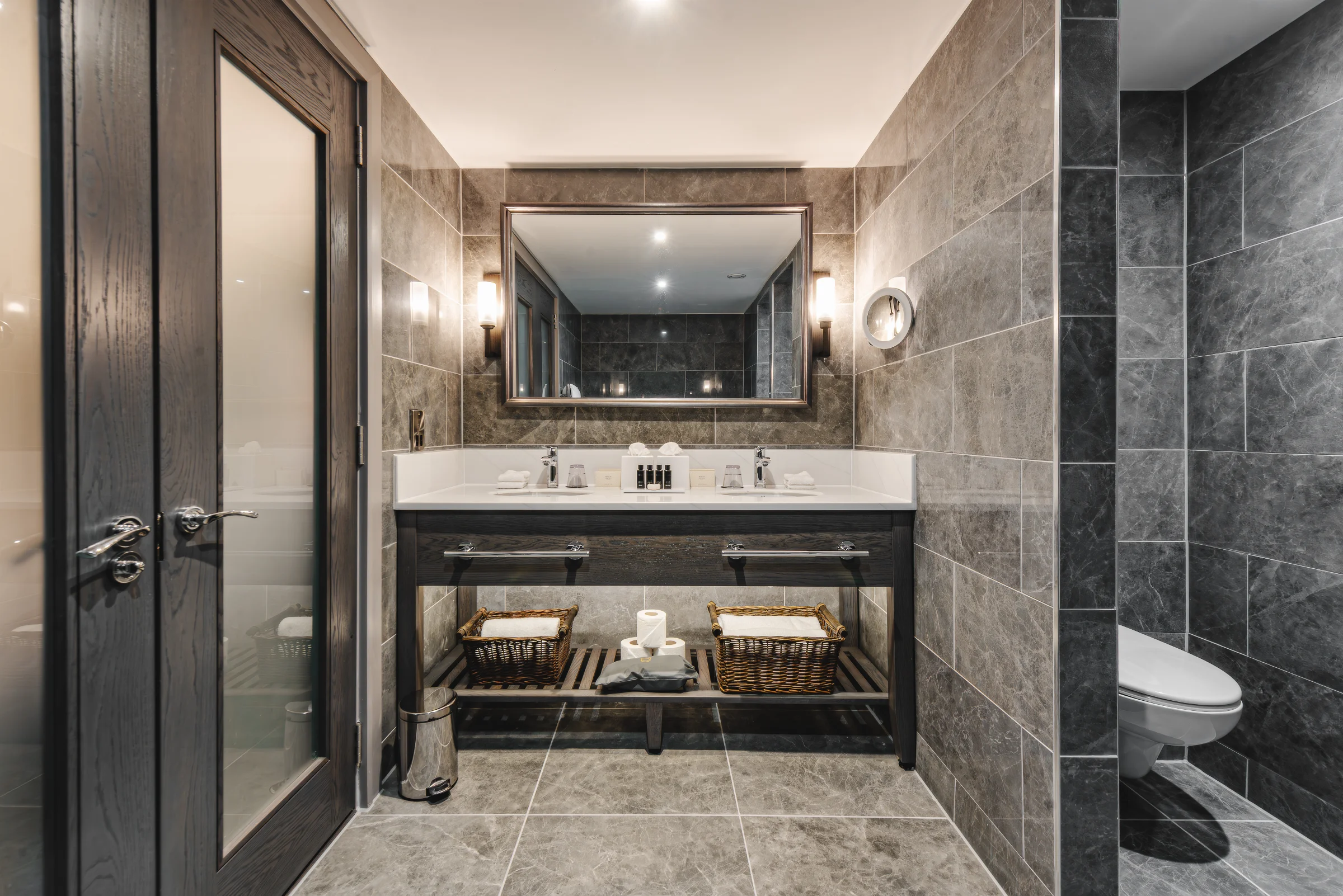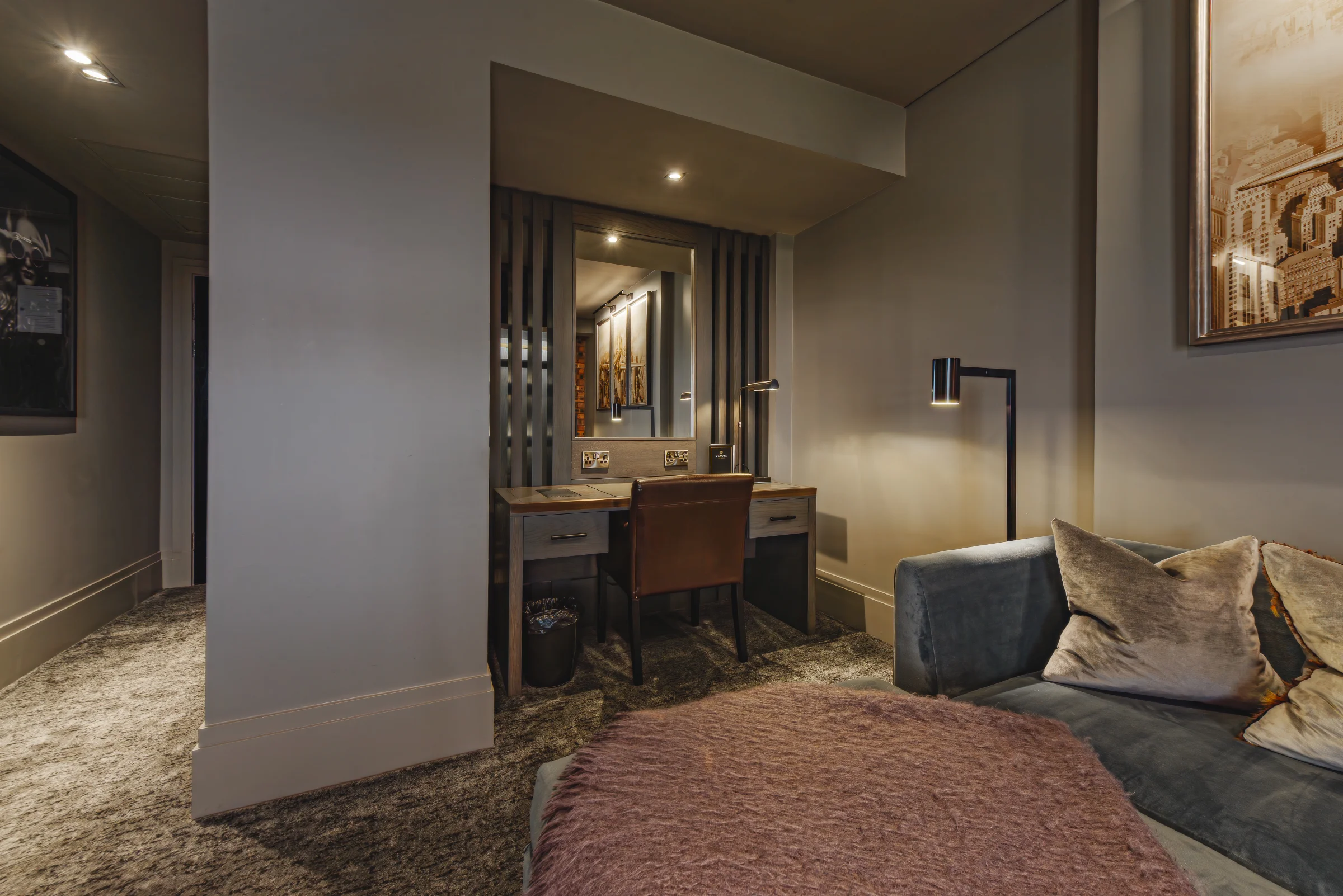 Indulge in luxury with a super-king size bed, separate bath, walk-in wardrobe, and stunning views of the Forth Rail Bridge. Includes private living room with two smart HDTVs, stocked mini-fridge, Nespresso machine, evening turndown and more.