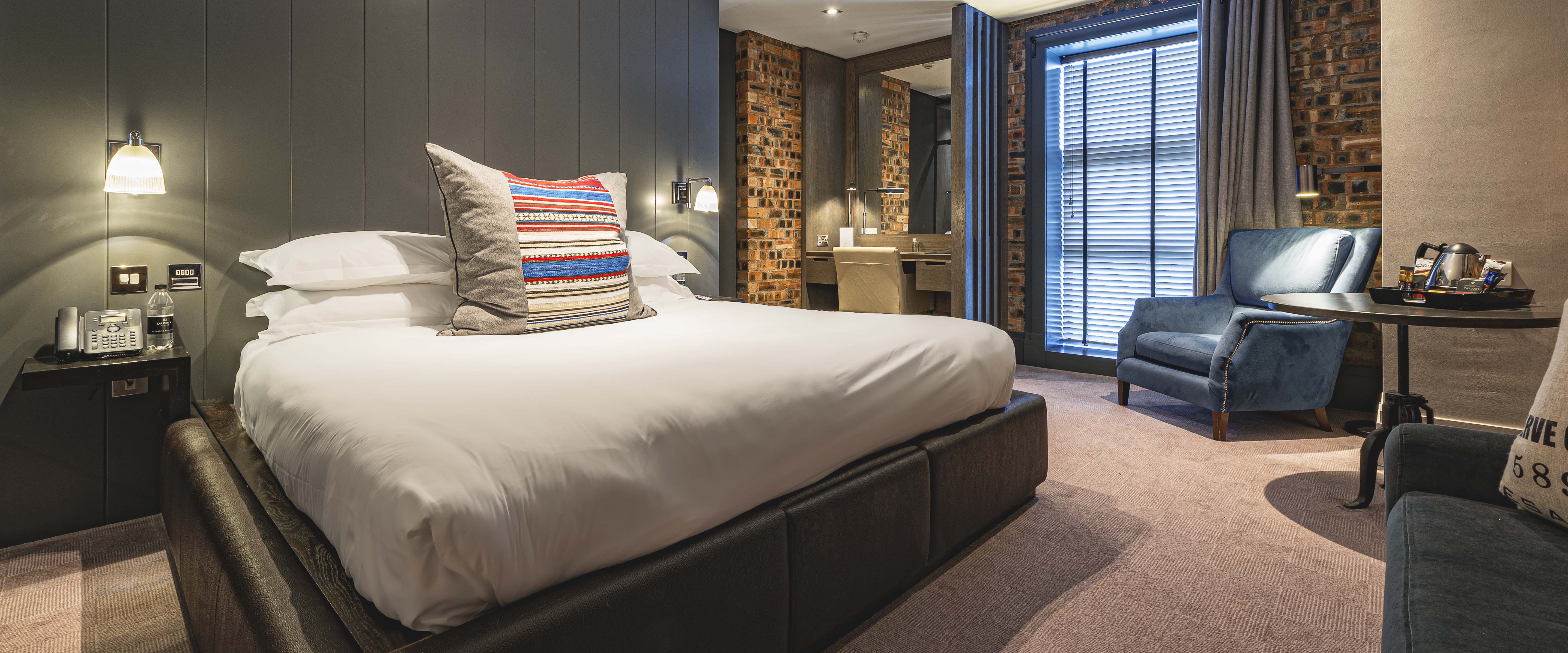Upscale downtime. Elegant contemporary room with a super-king-size bed, additional living area, and 48" HDTV with Sky Sports.