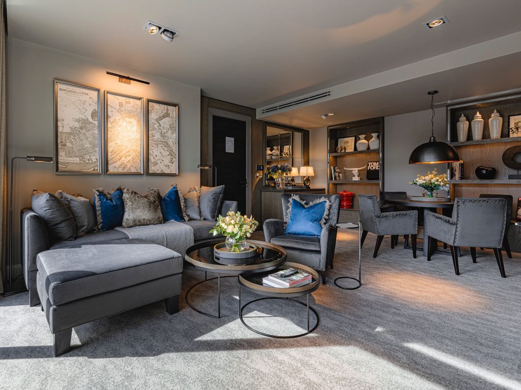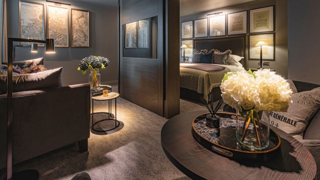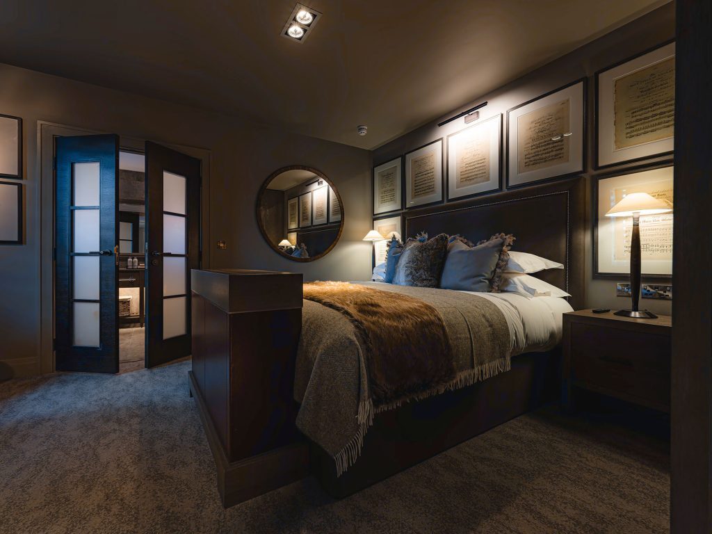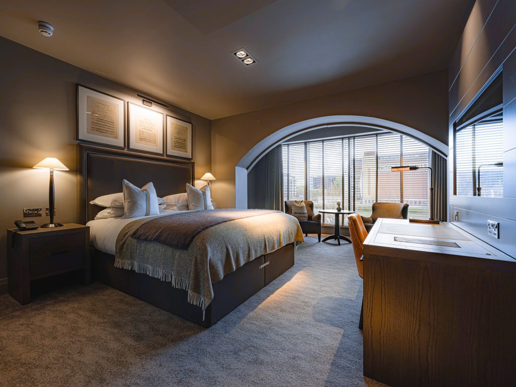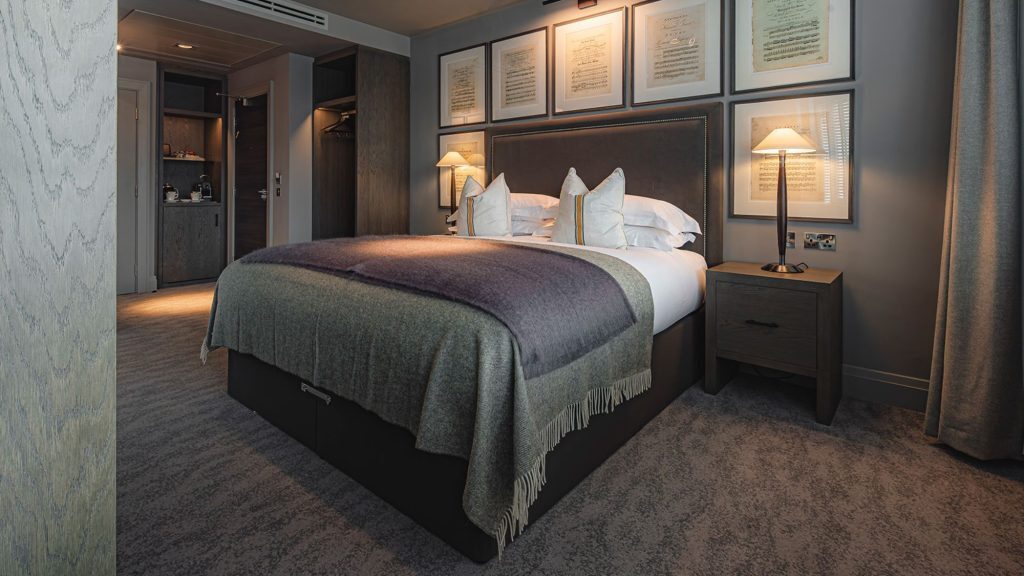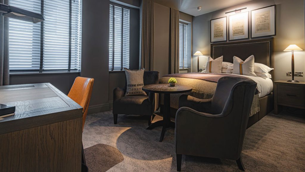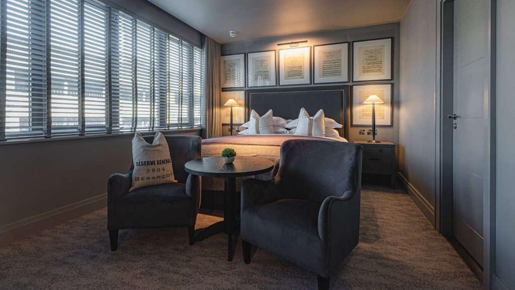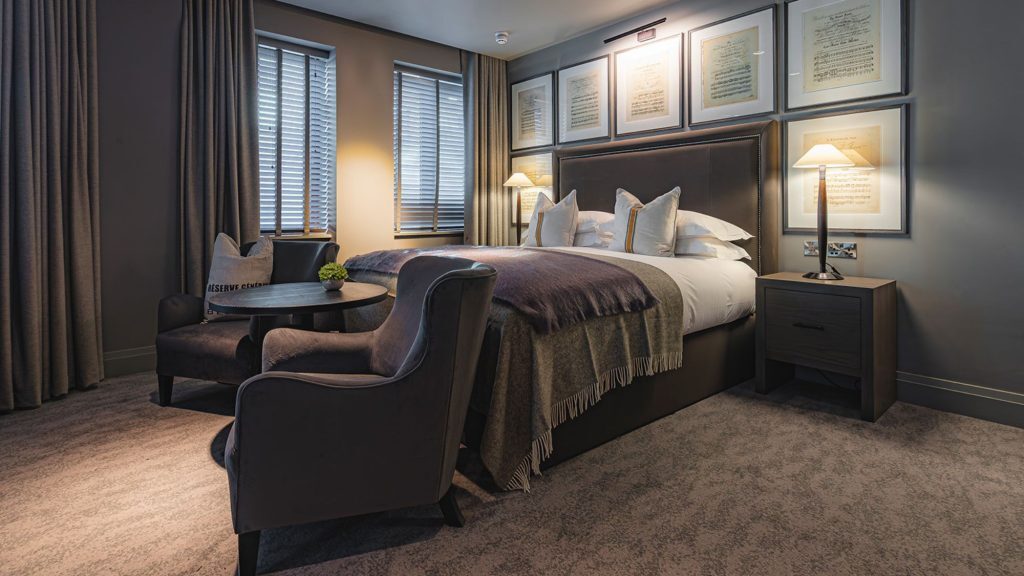 Apple TV with streaming apps and Sky Sports package — Ensuite bathroom with rainfall shower — Luxury toiletries — Tea and coffee tray, bottled water — Crisp cotton linen and sumptuously soft bedding — Hairdryer — Iron & ironing board — In-room safe — Valet parking service (optional & chargeable) — Complimentary high speed WiFi
