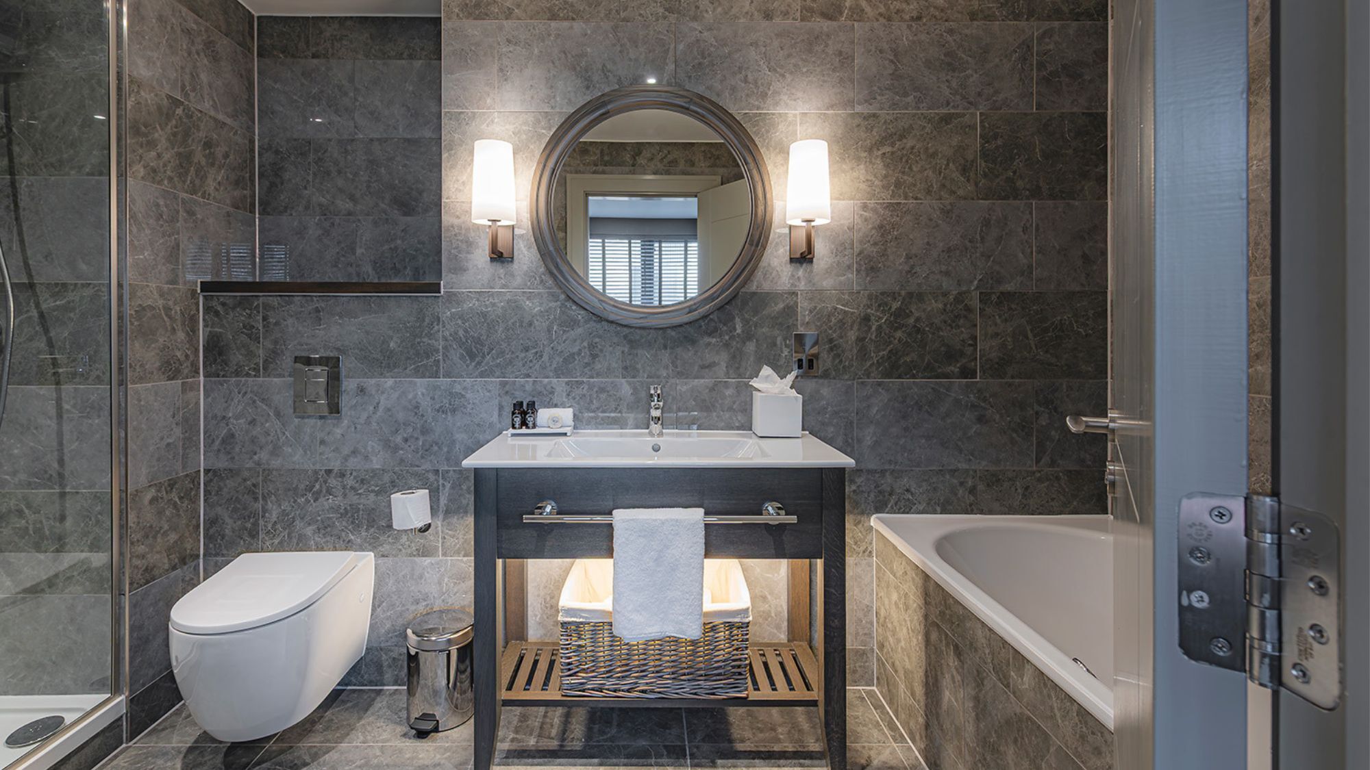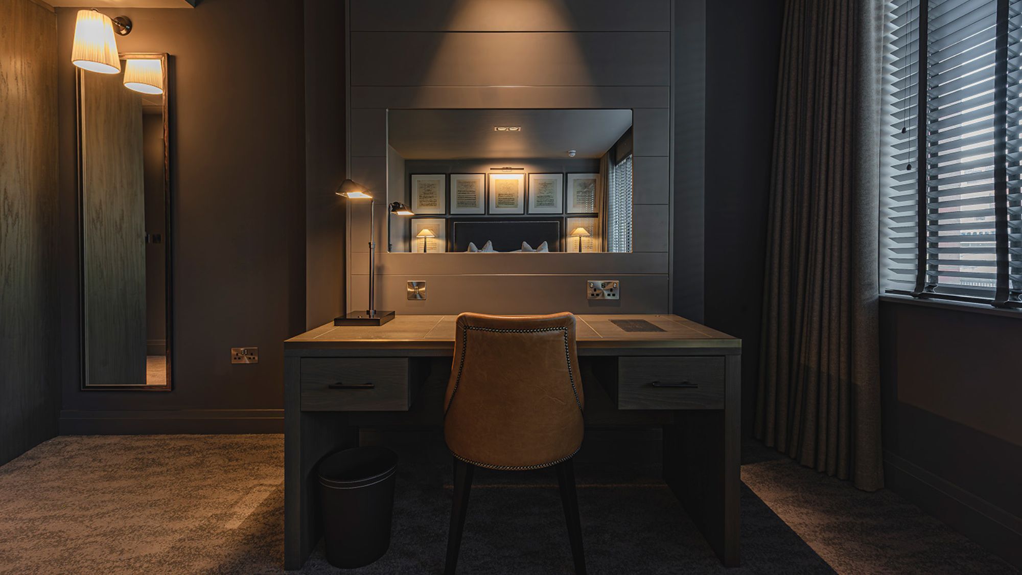 Super king-size bed with crisp cotton linens — Apple TV with streaming apps and Sky Sports package — Work desk — Blackout curtains — Ensuite bathroom with rainfall shower — Bath — Luxury toiletries — Slippers — Tea and coffee, bottled water — Hairdryer — Iron & ironing board — In-room safe — Complimentary high speed Wi-Fi
