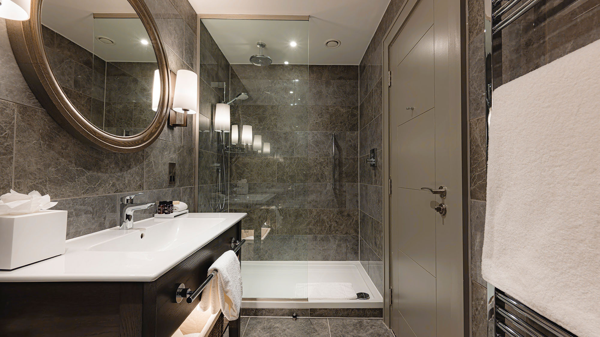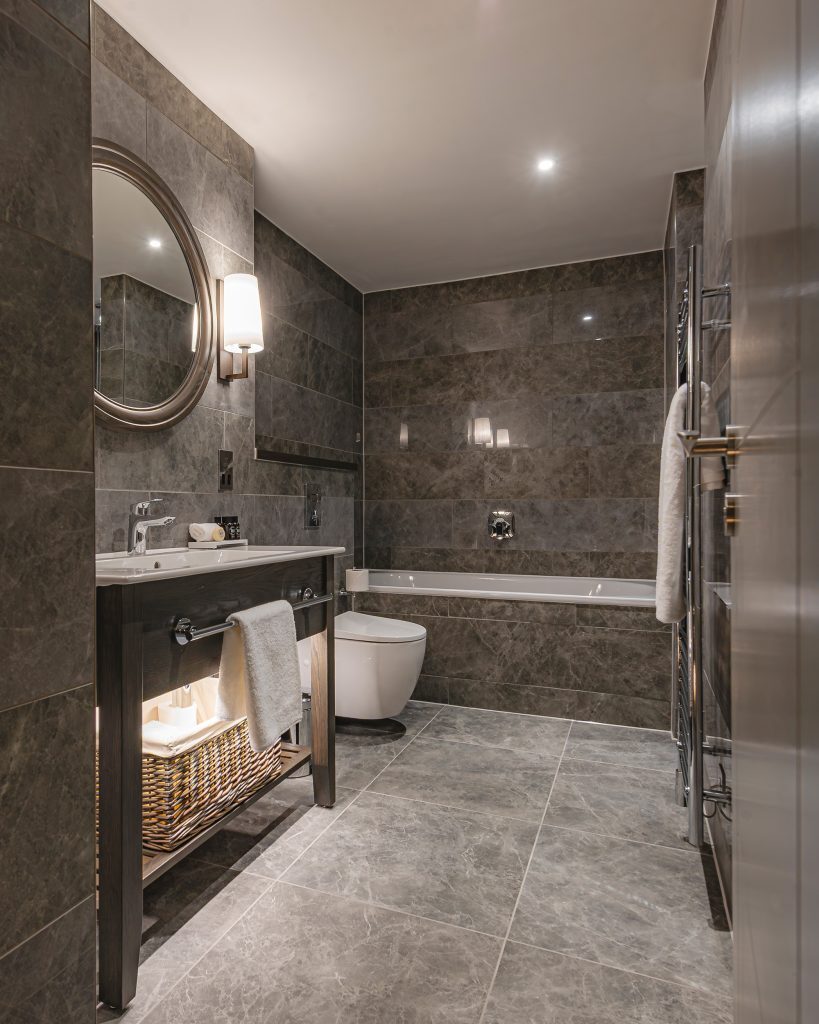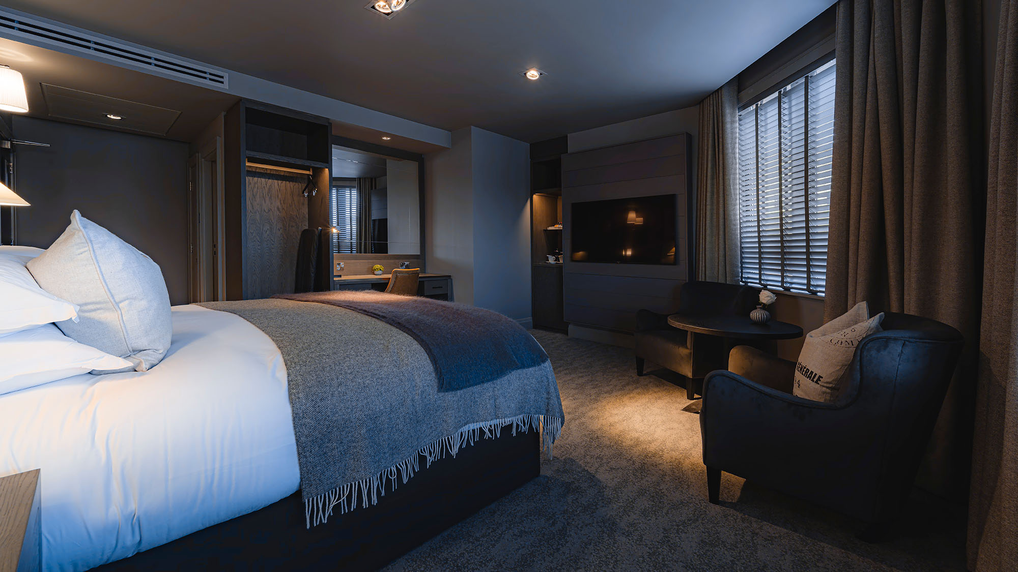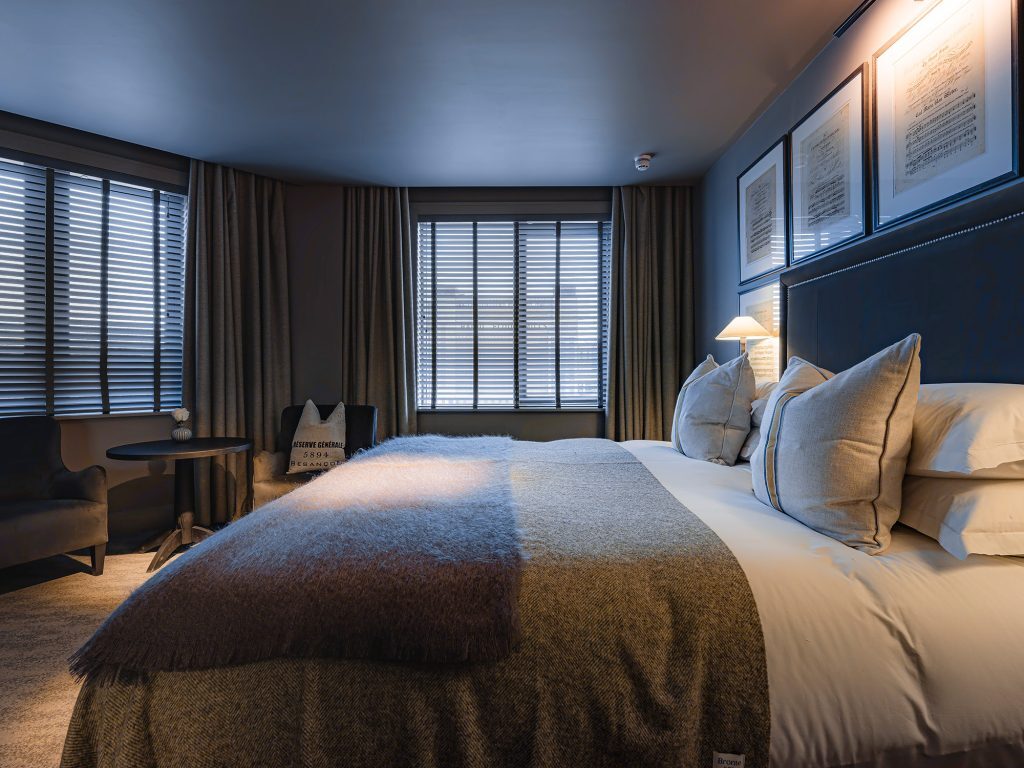 Super king-size bed with crisp cottons linens — Apple TV with streaming apps and Sky Sports package — Work desk — Crisp cotton linen and sumptuously soft bedding — Blackout curtains — Ensuite bathroom with rainfall shower — Separate bath — Luxury toiletries — Bath robe and slippers — Complimentary mini-fridge — Nespresso machine — Tea and coffee, bottled water — Hairdryer — Iron & ironing board — In-room safe — Complimentary high speed Wi-Fi — Evening turndown service