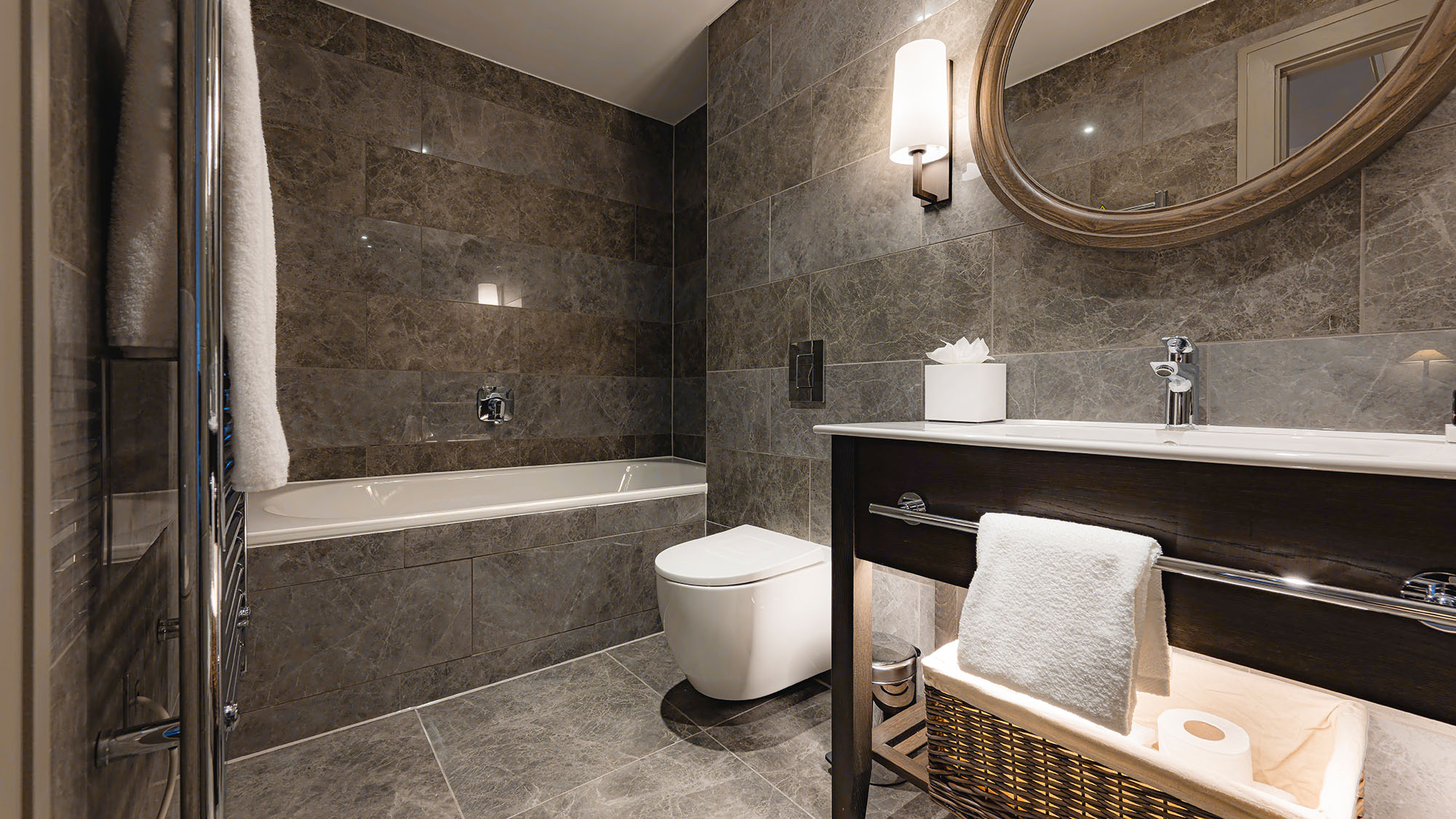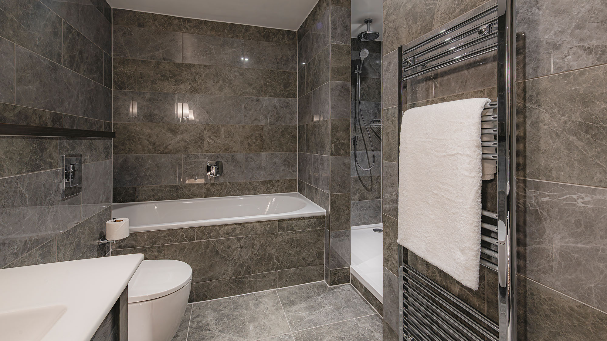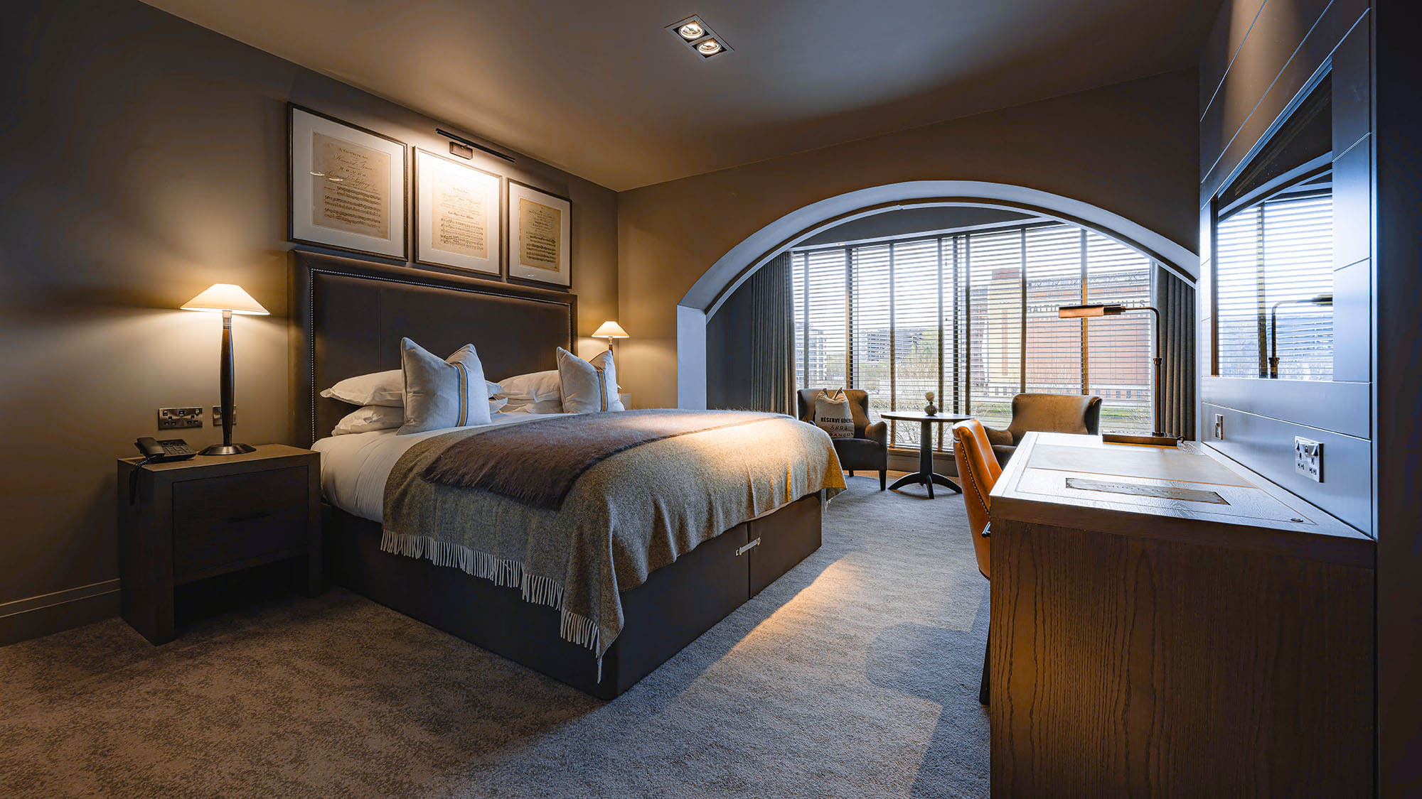 Super king-size bed with crisp cottons linens — Apple TV with streaming apps and Sky Sports package — Work desk — Crisp cotton linen and sumptuously soft bedding — Blackout curtains — Ensuite bathroom with rainfall shower — Separate bath — Luxury toiletries — Bath robe and slippers — Complimentary mini-fridge — Nespresso machine — Tea and coffee, bottled water — Hairdryer — Iron & ironing board — In-room safe — Complimentary high speed Wi-Fi — Evening turndown service